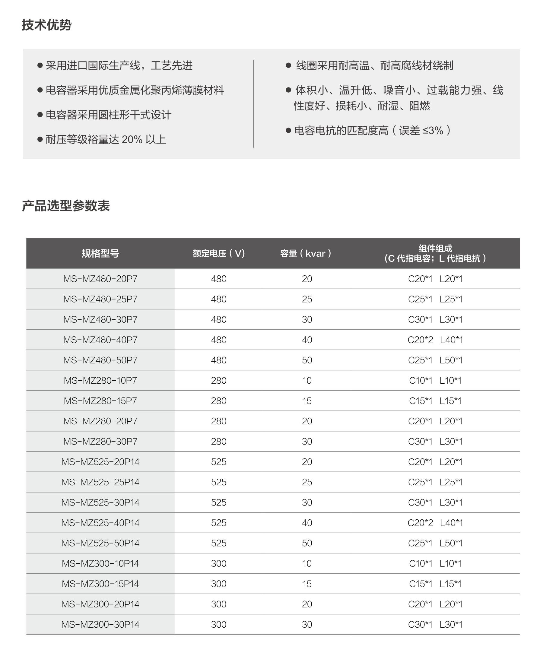 MS-MZ 系列濾波補償組件是為改善電力系統(tǒng)功率因數及諧波濾波而開發(fā)制造的電容電抗組件,該組件分為共補和分補,可分別用于三相和單相的無功補償系統(tǒng)中。補償組件將圓柱形電容器和電抗器組合在一起,使LC串聯回路調諧頻率更加準確恒定,為用戶提供壽命更長、損耗更低、使用更方便、更安全可靠的產品。